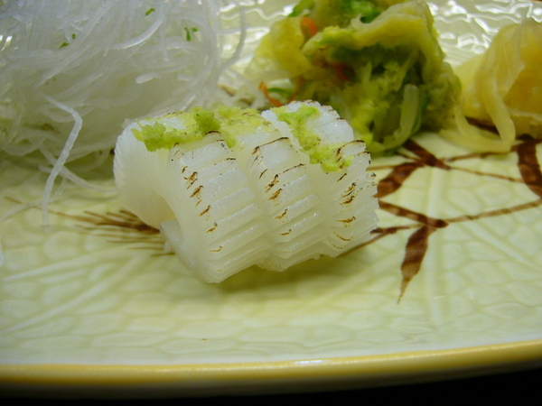 只見師傅拿出了只剝了皮還沒有切過的整尾軟絲,