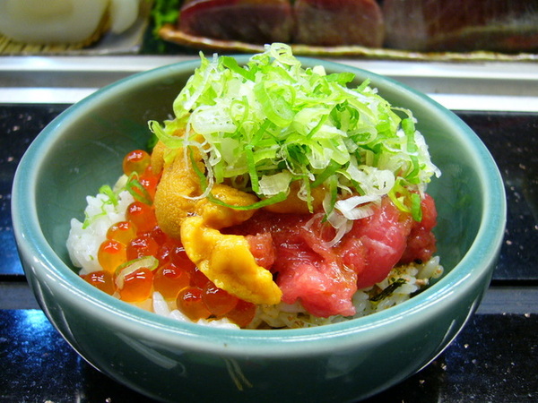 簡稱三色丼的鮪魚海膽鮭魚子蔥花丼